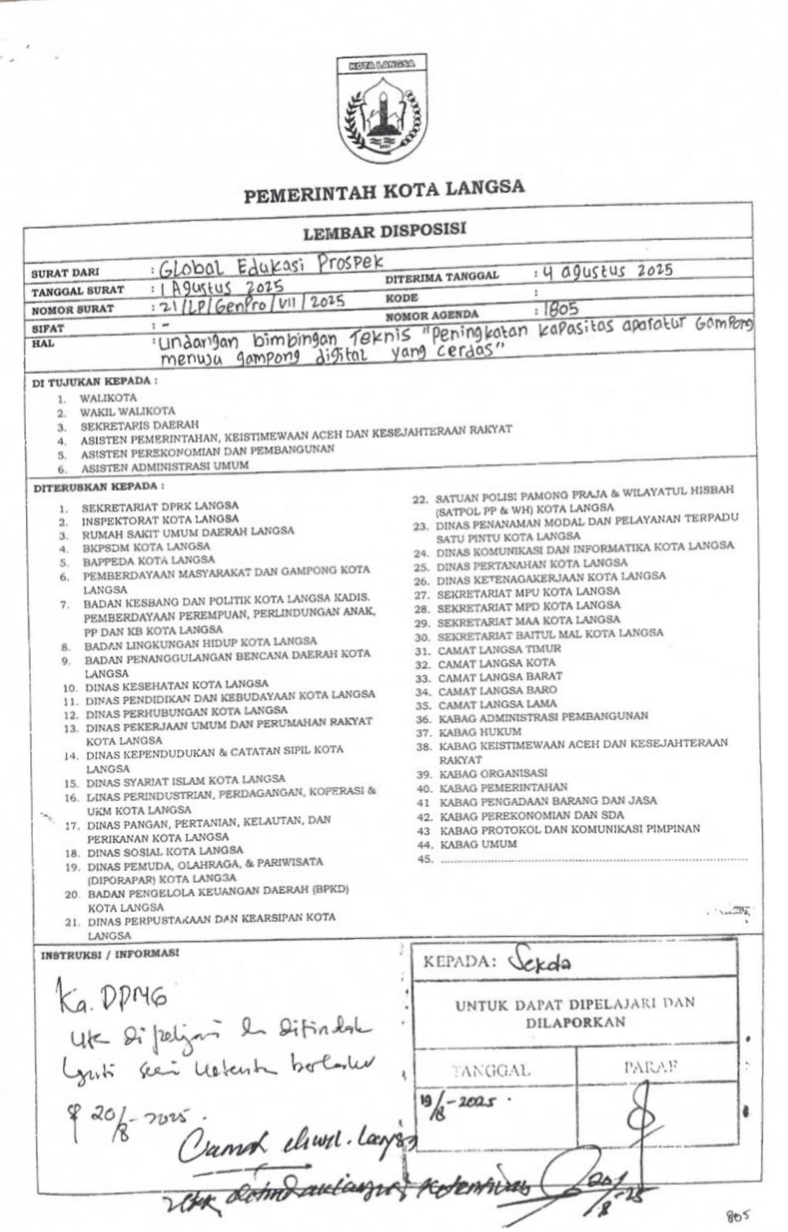 Dalam disposisi surat pemko langsa yang diterima tanggal 4 Agustus 2025 dengan nomor agenda 1805, diketahui bahwa kegiatan ini dilaporkan kepada Kepala DPMG Kota Langsa untuk dipelajari dan ditindaklanjuti, serta kepada Sekretaris Daerah dan para camat pada 19–20 Agustus 2025.