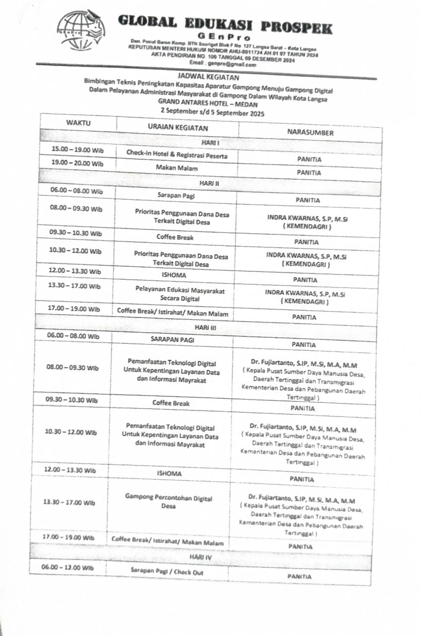 Berdasarkan informasi yang dihimpun wartawan dari sumber terpercaya, dengan sejumlah Perangkat Gampong, kegiatan tersebut diinisiasi oleh pihak ketiga bernama LsM Global Edukasi Prospek. Surat undangan dengan nomor 21/LP/Gen-Pro/VIII/2025 ditujukan kepada Wali Kota langsa, dengan jadwal kegiatan pada 2–5 september 2025 di hotel grand antares medan-sumatera utara.