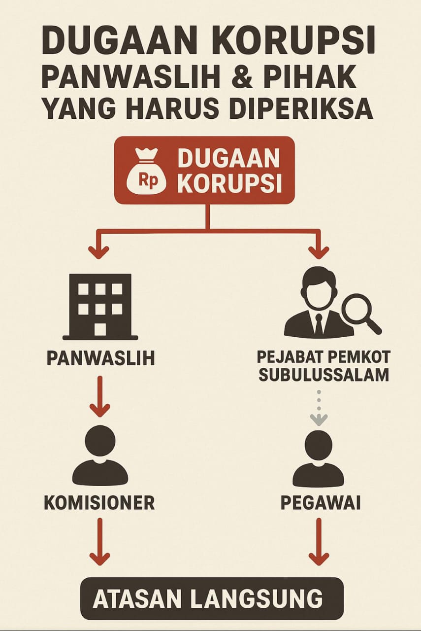 Subulussalam – Kasus dugaan korupsi dana hibah Panitia Pengawas Pemilu (Panwaslih) Kota Subulussalam senilai Rp 4 miliar terus menjadi sorotan. Masyarakat menuntut agar penyidik Kejaksaan Negeri (Kejari) Subulussalam tidak berhenti pada pemeriksaan lima komisioner Panwaslih dan bendahara sekretariat, tetapi juga menelusuri kemungkinan keterlibatan pejabat teras Pemerintah Kota Subulussalam yang diduga memberi restu sekaligus menjadi inisiator penyimpangan dana tersebut.